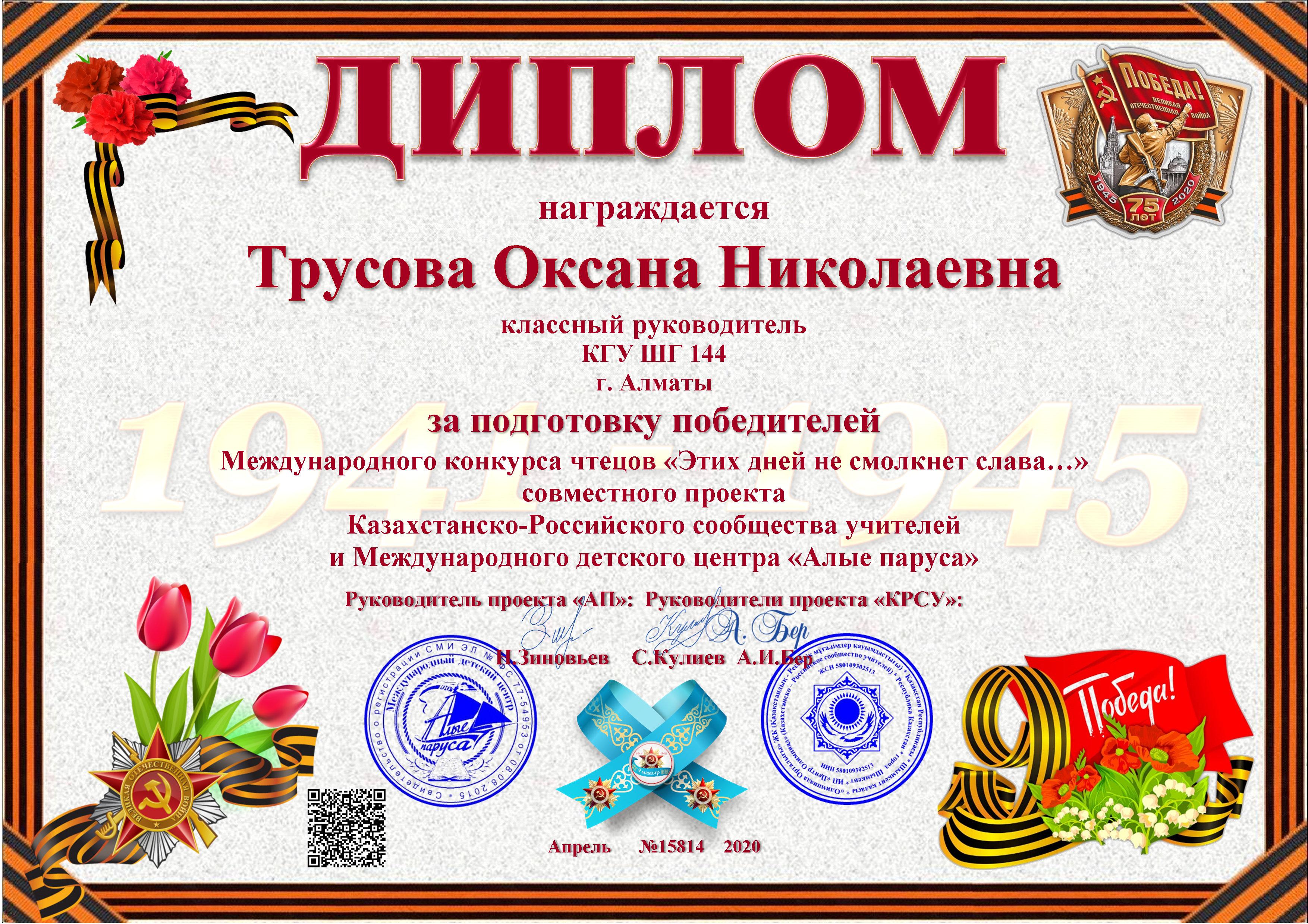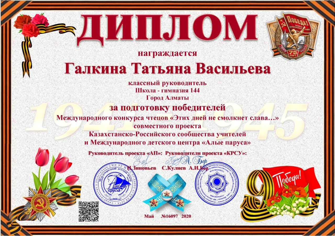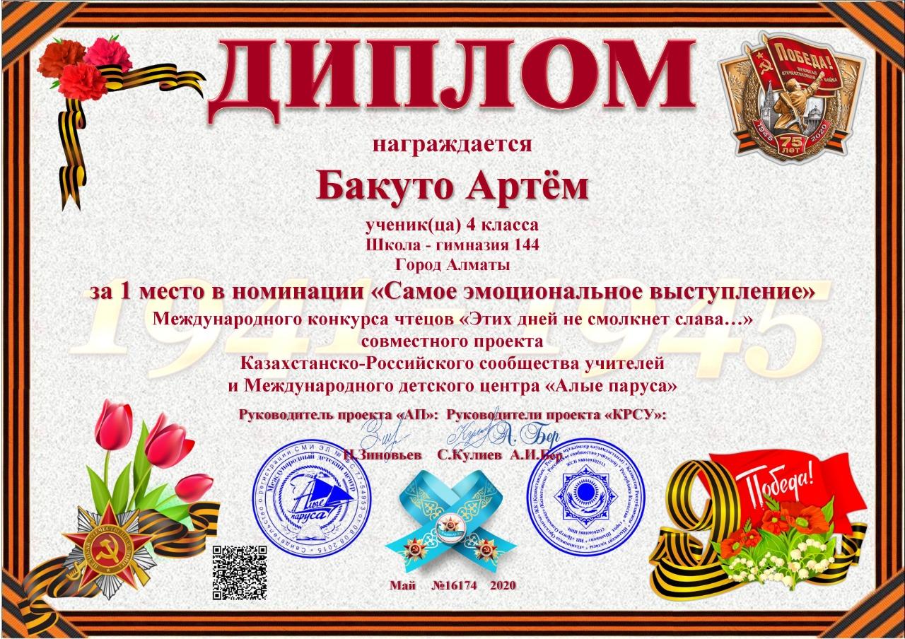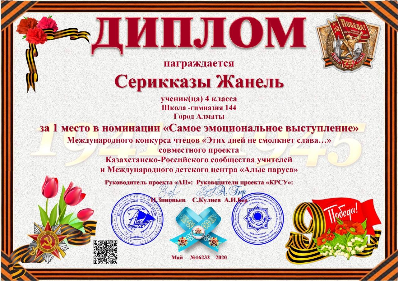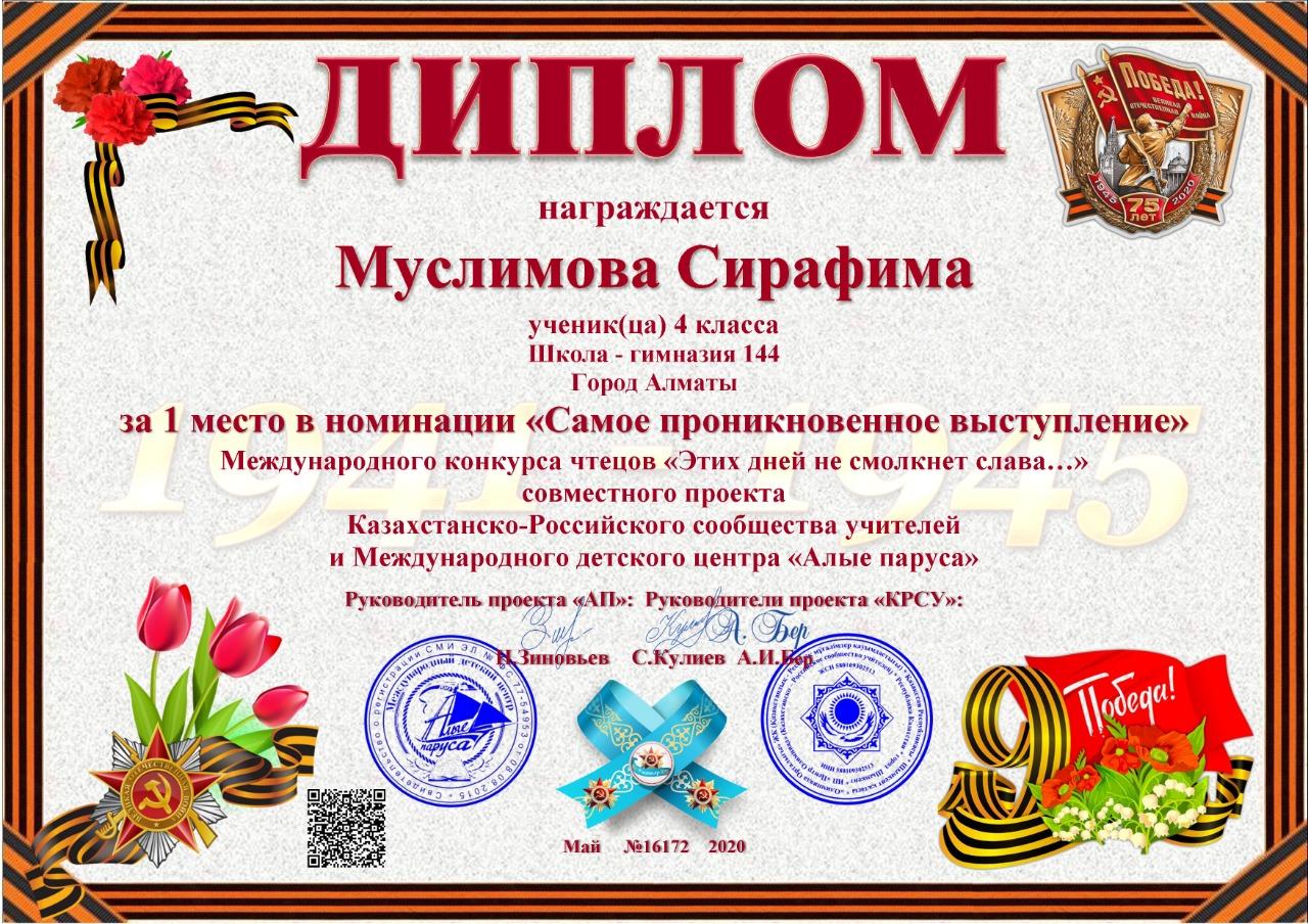 Учащиеся КГУ "школа-гимназия № 144" Надырова Камилла 4 «А» класс, Бакуто Артем, Серикказы Жанель, Абдуллина Анися 4 "Б" класс, Муслимова Серафима 4 "В" класс заняли призовые места в номинации «Самое проникновенное выступление» в Международном конкурсе чтецов «Этих дней не смолкнет слава...»