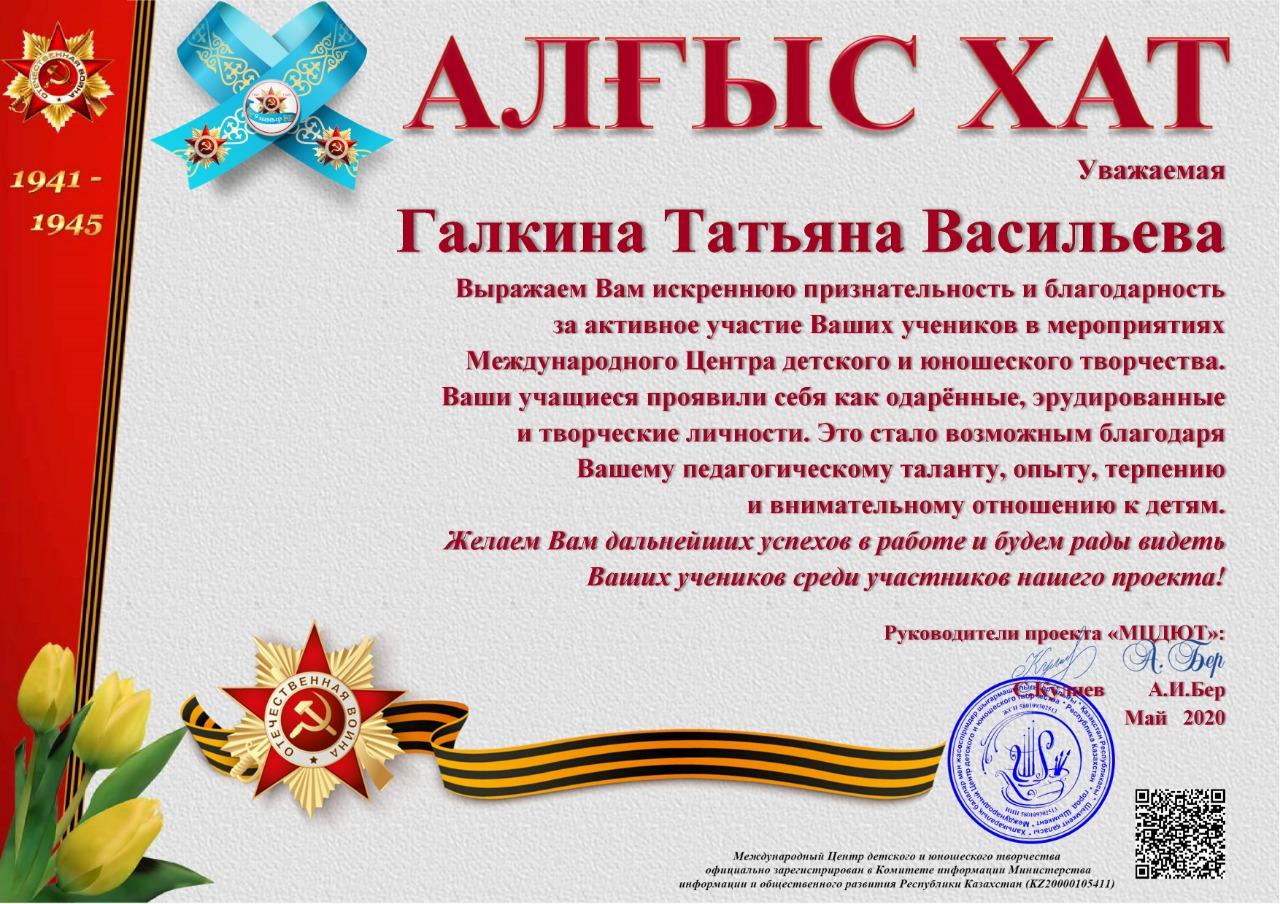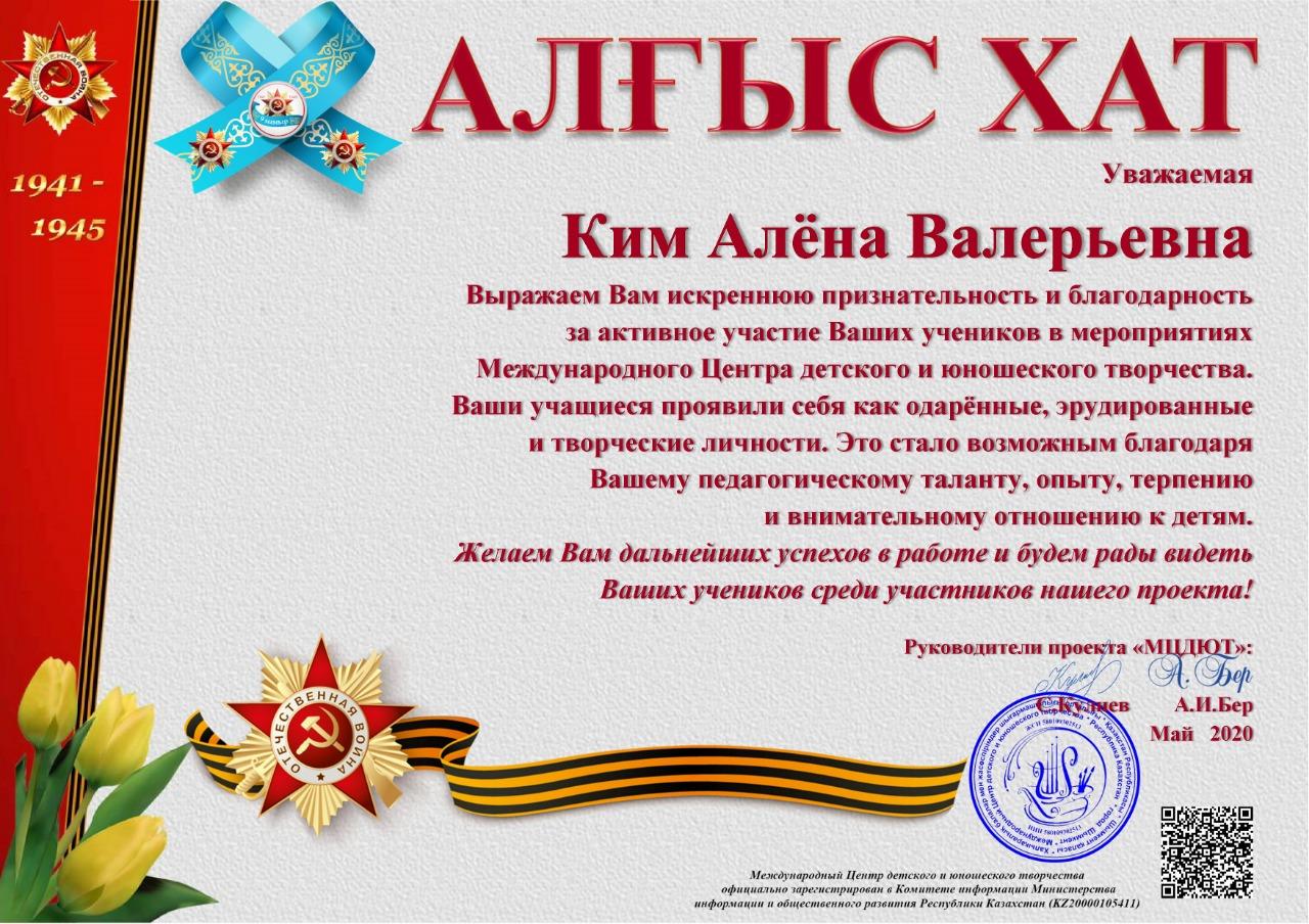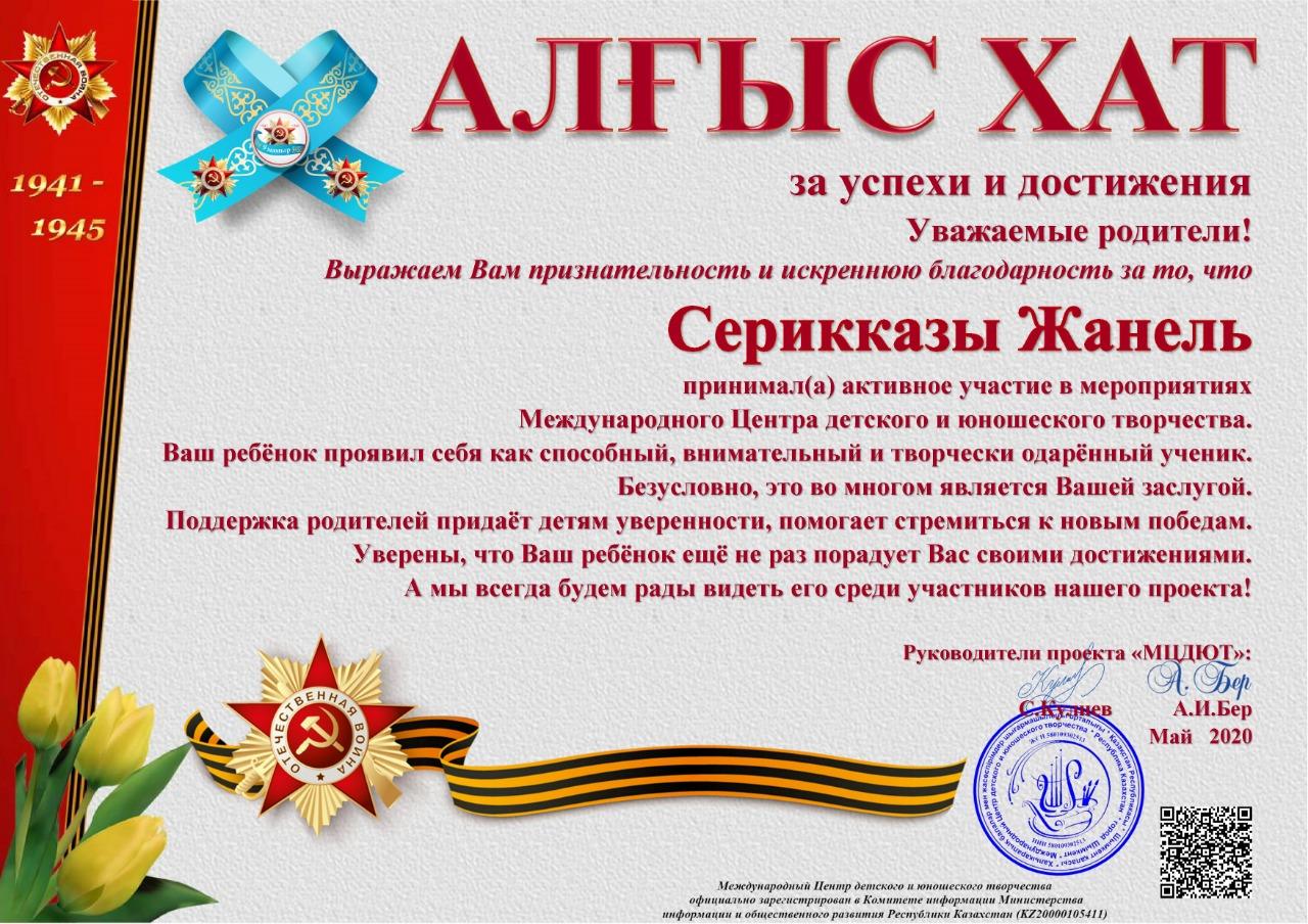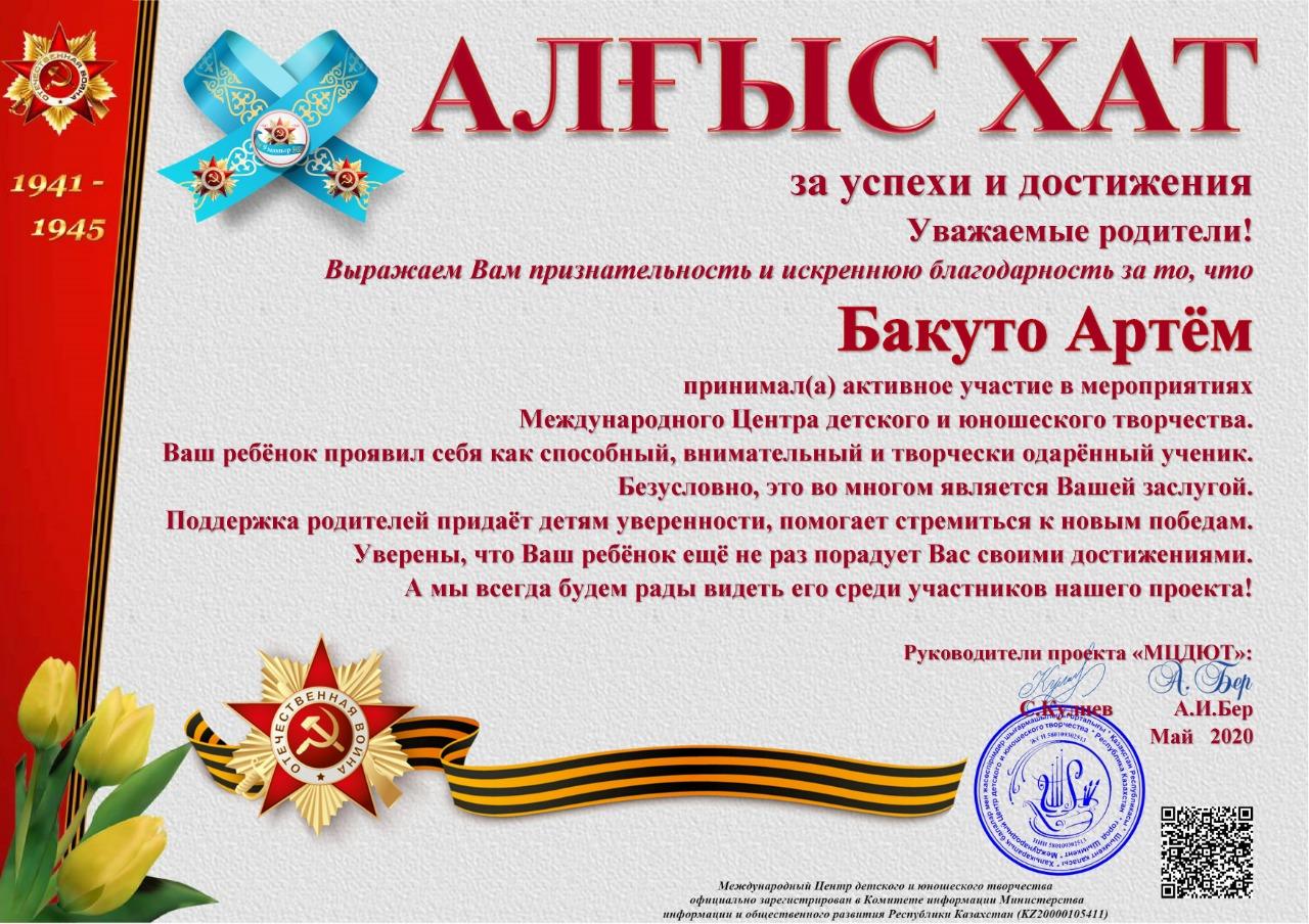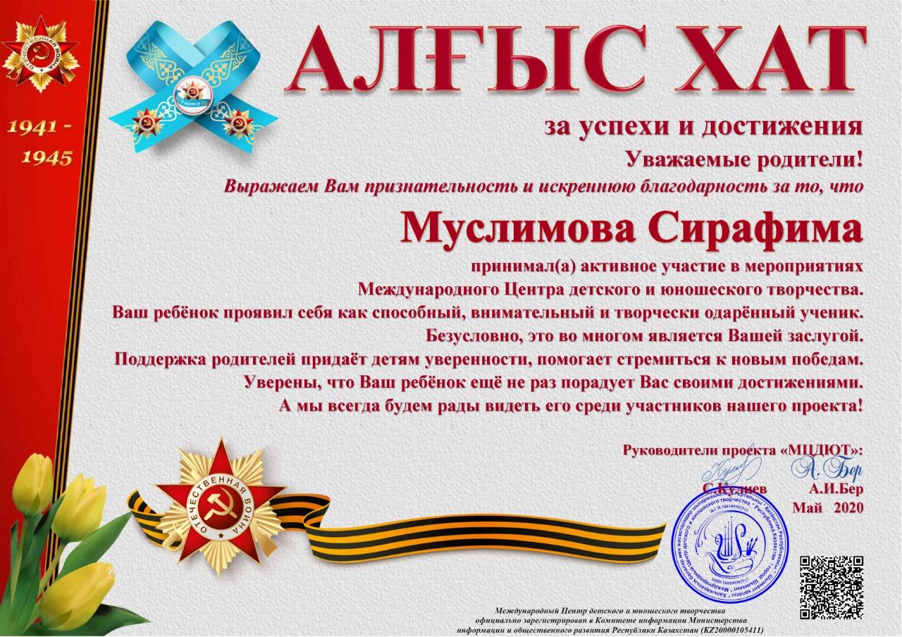 Учащиеся КГУ "школа-гимназия № 144" Надырова Камилла 4 «А» класс, Бакуто Артем, Серикказы Жанель, Абдуллина Анися 4 "Б" класс, Муслимова Серафима 4 "В" класс заняли призовые места в номинации «Самое проникновенное выступление» в Международном конкурсе чтецов «Этих дней не смолкнет слава...»