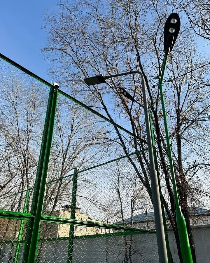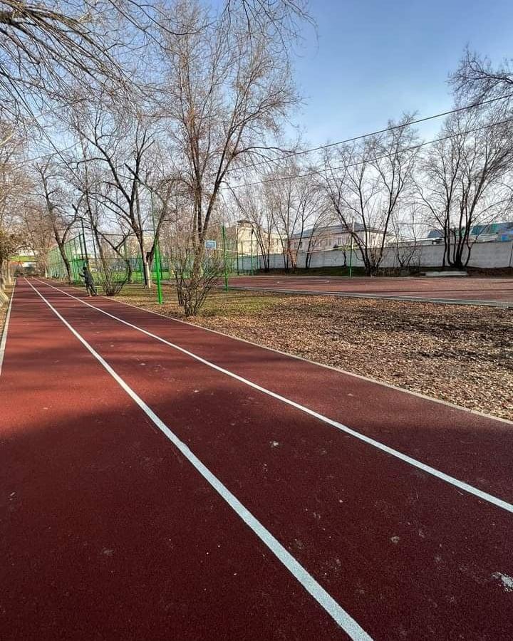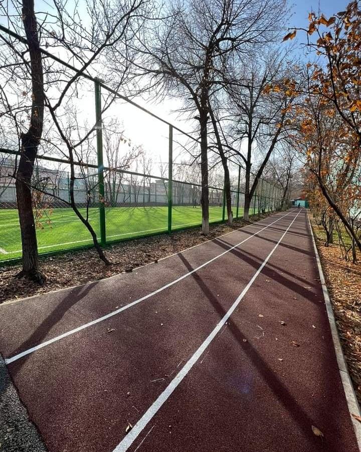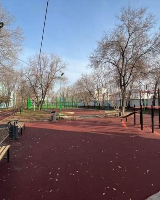 Установлена современная воркаут зона, беговая дорожка с мягким, тартановым покрытием, поле для футбола из высококачественного турецкого газона,баскетбольная и волейбольная площадки, также с тартановым покрытием, по периметру установлено яркое освещение и круглосуточное видеонаблюдение.
