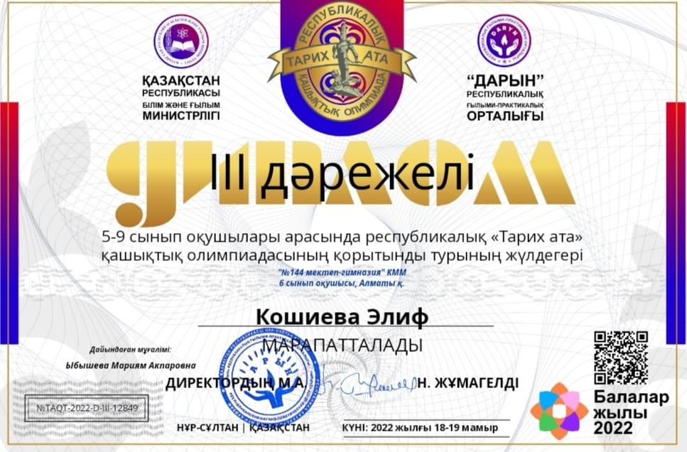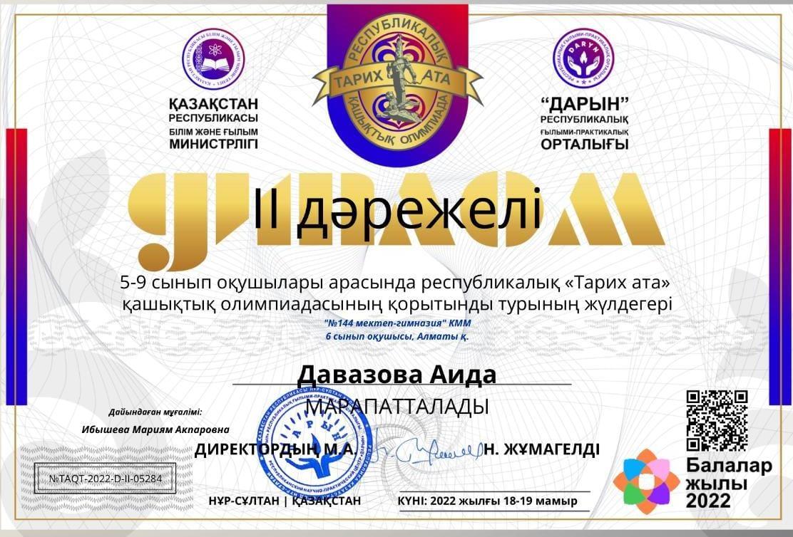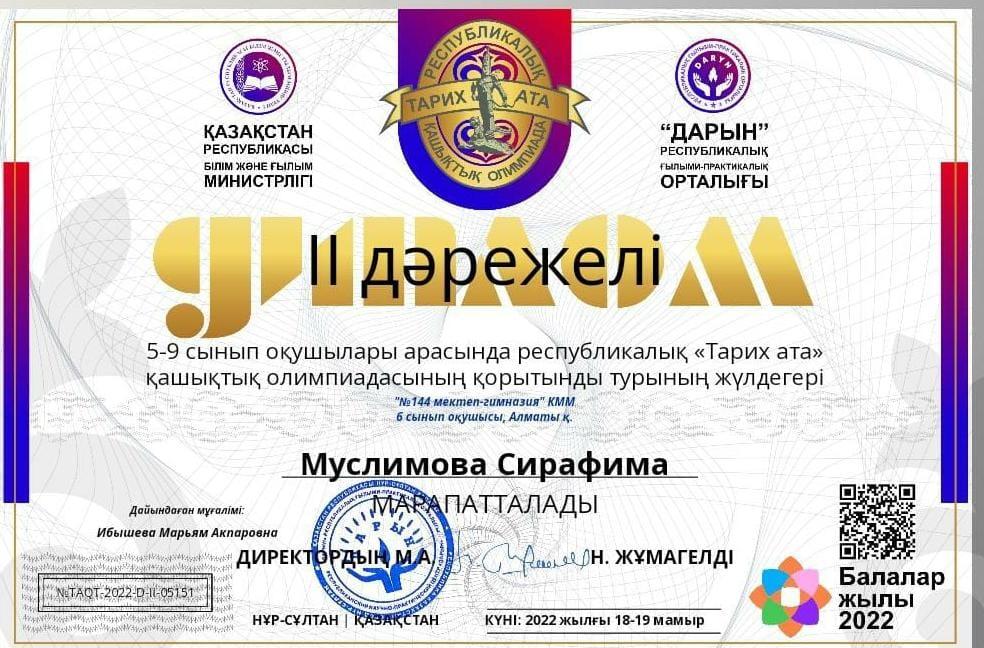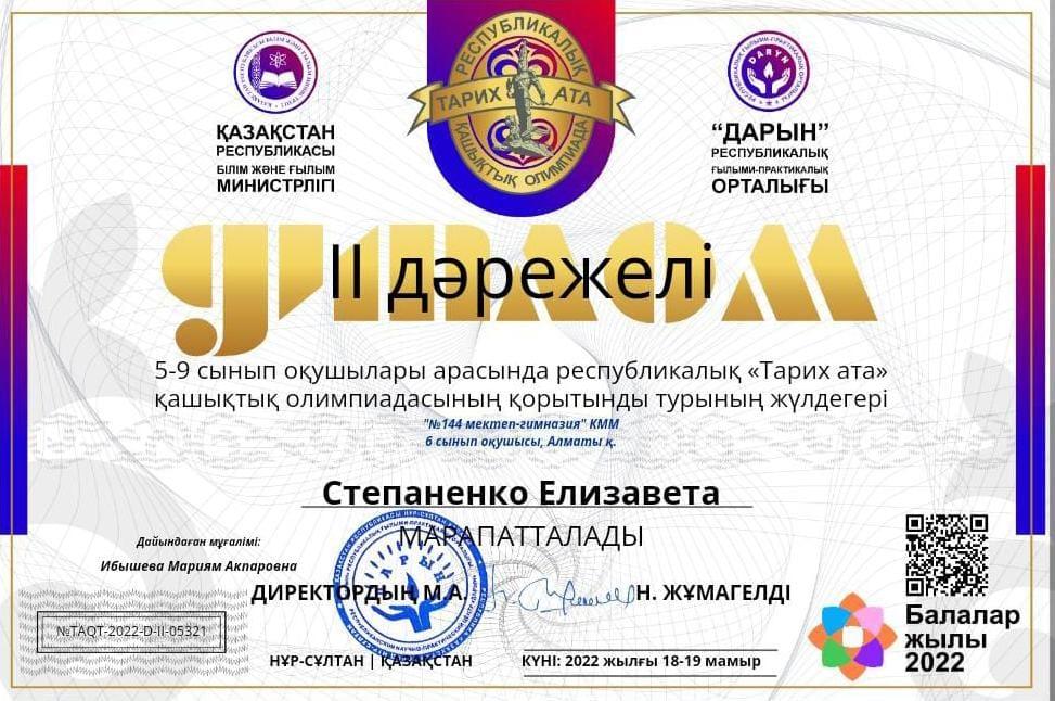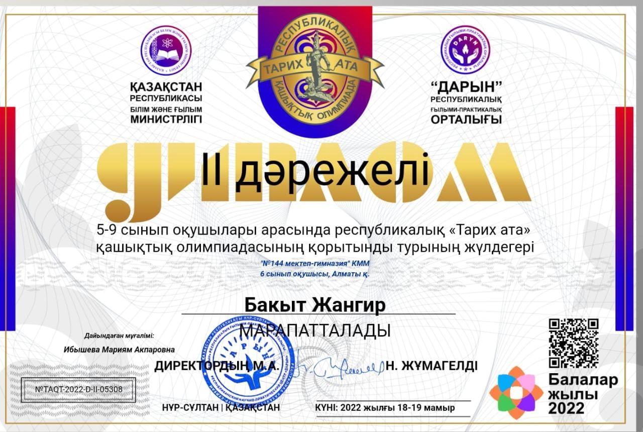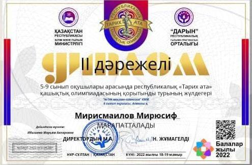 27 мамыр 2022 0 1 2 3 4 5 Республиканская олимпиада по истории "Тарих ата" Поздравляем наших призёров Республиканской олимпиады по истории "Тарих ата"! С благодарностью хочется отметить работу, по подготовке учащихся к олимпиаде, наших лучших историков - Ибышевой Мариям Акпаровны и Канагатовой Акмарал Иркенгожаевны! Осы беттің QR-коды:QR-код этой страницы: