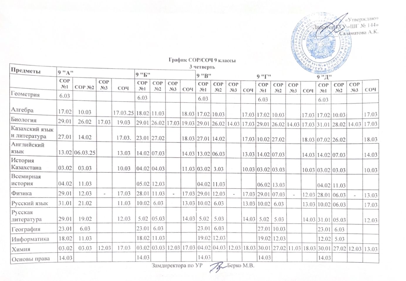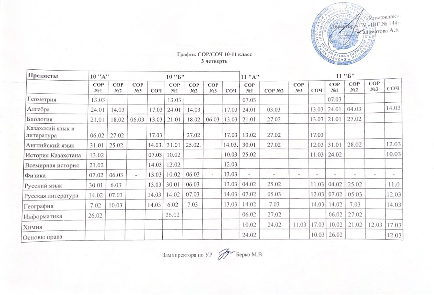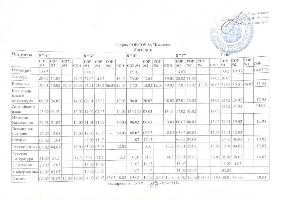 График СОР/СОЧ 3 четверть » №144 мектеп-гимназия