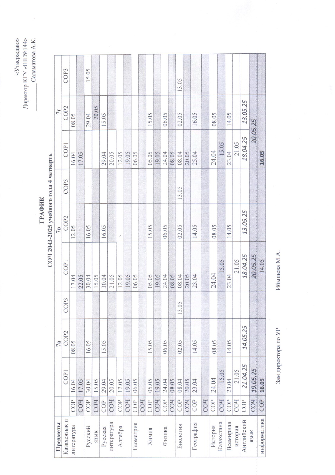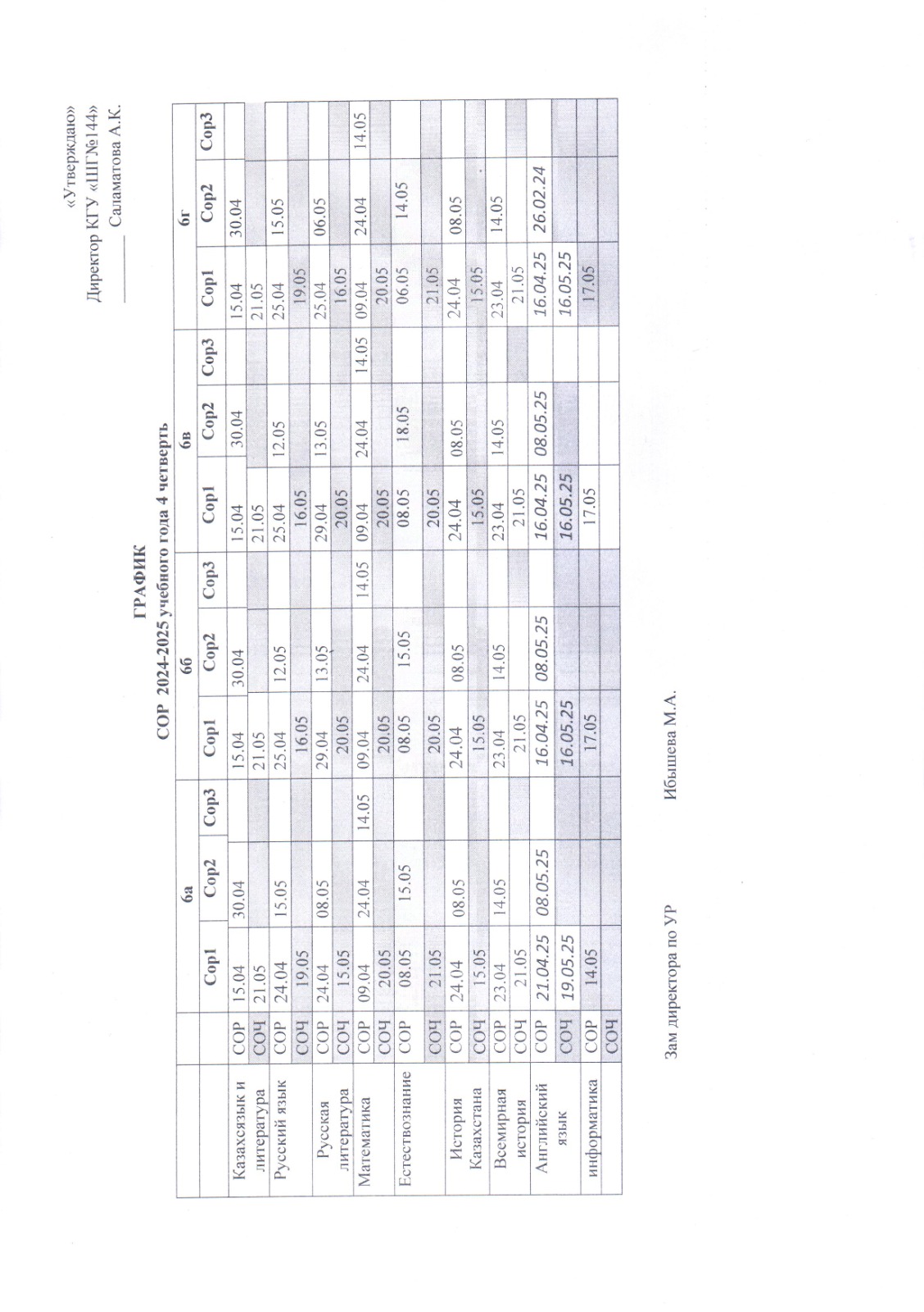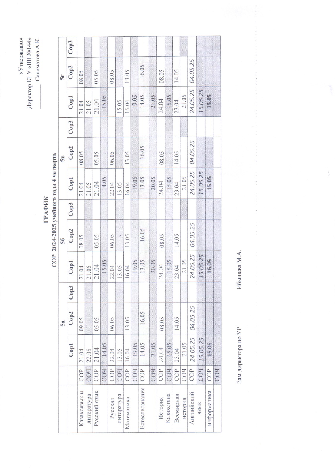 ГРАФИК СОР СОЧ 4 ЧЕТВЕРТЬ 2 СМЕНА » №144 мектеп-гимназия
