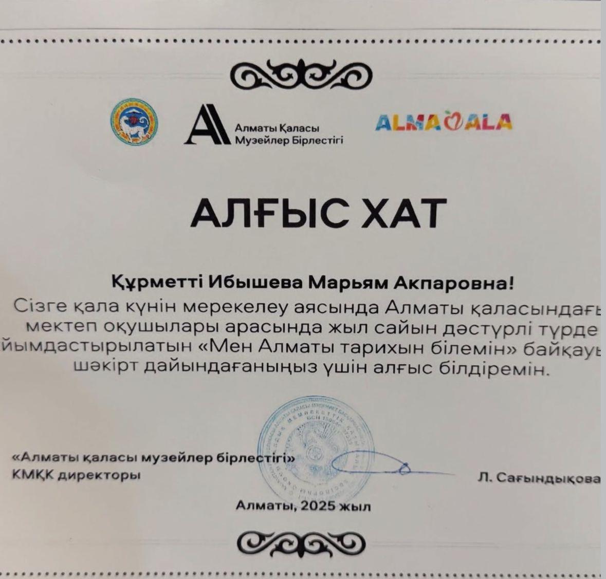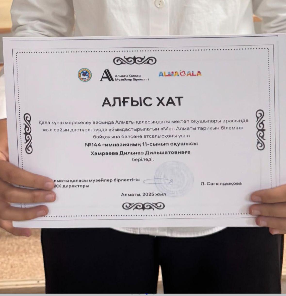 Ученица школы-гимназии №144 отмечена благодарственным письмом от Объединения музеев города Алматы