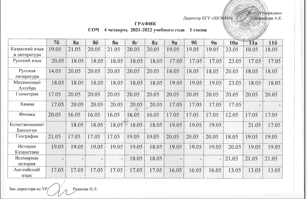 График СОЧ 4 четверть » №144 мектеп-гимназия