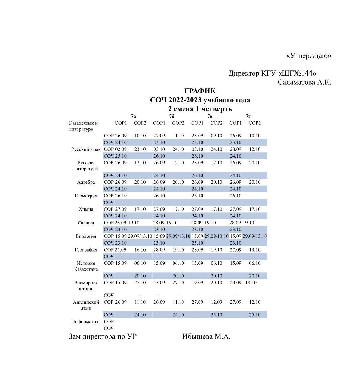 График СОР и СОЧ 1 четверть » №144 мектеп-гимназия
