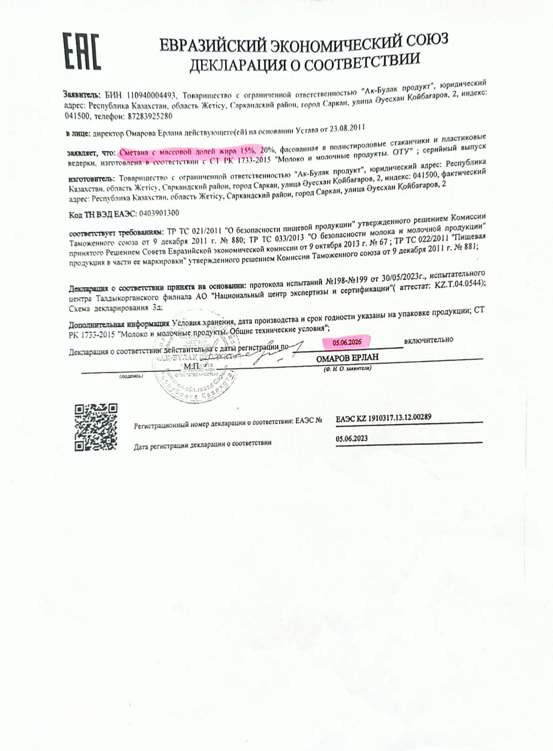 05 маусым 2023 0 1 2 3 4 5 Декларация о соответствии: Сметана с массовой долей жира 15% Осы беттің QR-коды:QR-код этой страницы: