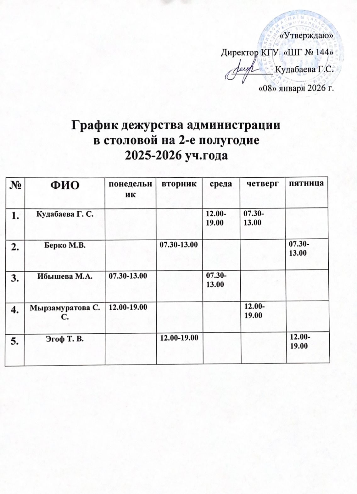 График дежурства администрации » №144 мектеп-гимназия