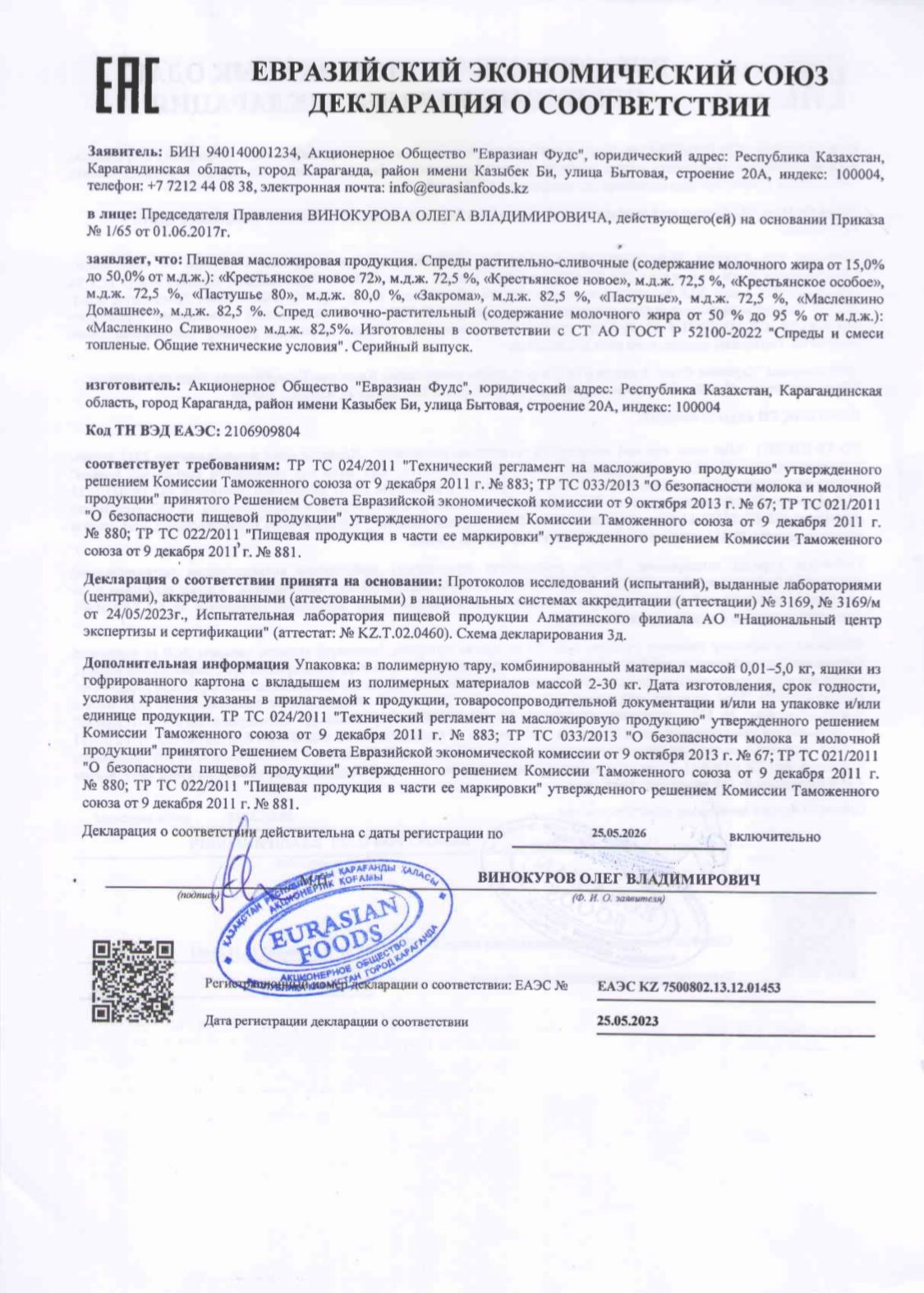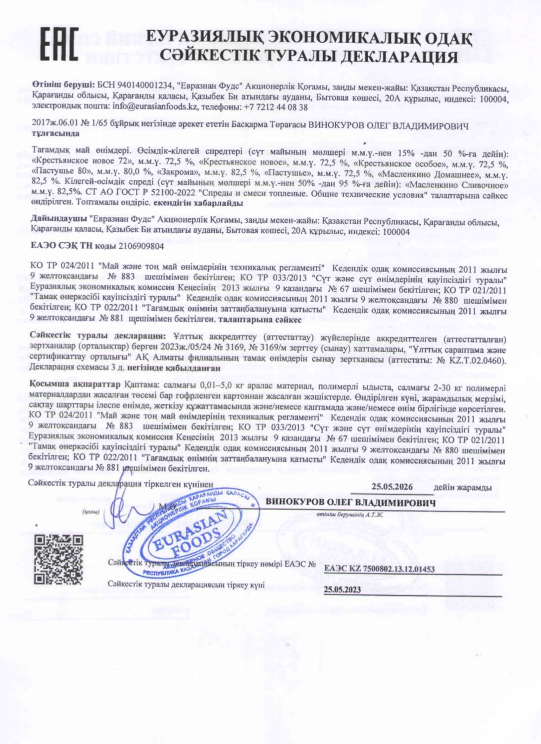 25 мамыр 2023 0 1 2 3 4 5 Декларация о соответствии: Пищевая масложировая продукция Осы беттің QR-коды:QR-код этой страницы: